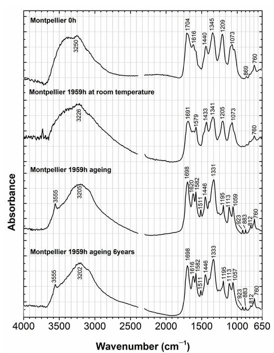 Infrared spectra for Montpellier applied to filter paper. Montpellier at t0 and t1959 h dark (protected at room temperature) and two spectra with aging at 50 °C, acquired after 6 years.