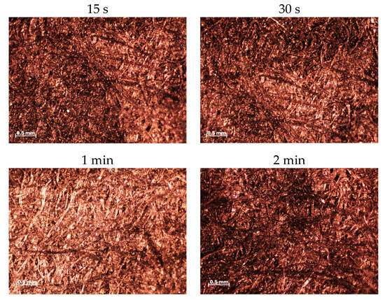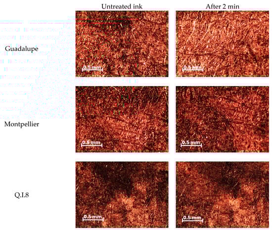 Experimentation with the gels was performed for 15 s, 30 s, 1 min, and 2 min, as shown in Figure 8 and Figure 9. Guadalupe was the ink for which 1 min were enough. For the Montpellier and QI.8 inks, times in the order of 2 × 1 min were necessary. With these gels, it was possible to remove carefully the degradation products and to keep the inks safe, as shown in Figure 9.
