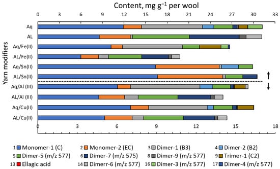 | R. acetosa | Total procyanidins (mg g−1 DM of dye) | 73.3 ± 9.7 | 7.2 ± 0.7 | |||