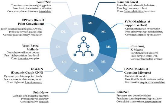 Recent years have seen major developments in automatic classification systems through the use of Artificial Intelligence techniques, particularly Machine Learning (ML) and Deep Learning (DL) (Figure 2), for semantic segmentation of point clouds, with the goal of supporting digital documentation of cultural heritage [6,7,8,9].