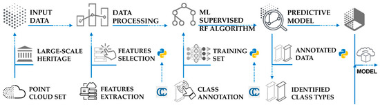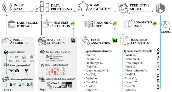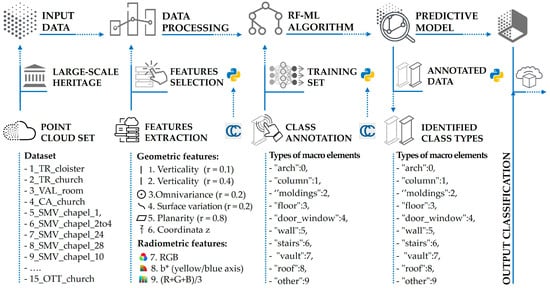 RF4PCC is a tool designed for automatic point cloud classification, with the ability to accurately identify and distinguish building elements. The methodological workflow of the analyzed algorithm consists of four main steps (Figure 5):