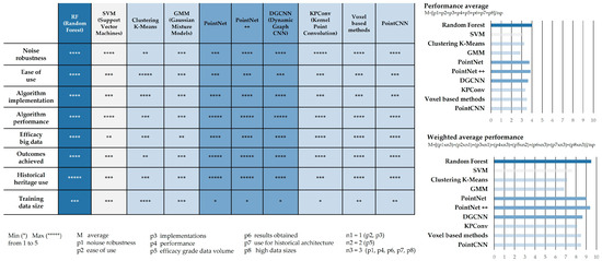 Specifically, with reference to the size of the dataset for training, a value of 5 was assigned to the algorithm with the lowest demand for data, while 1 was assigned to the algorithm with the highest demand. By calculating both arithmetic and weighted averages of these values (Figure 4), assigning higher weights to parameters considered more significant, it was found that the Random Forest algorithm stands out for high performance, comparable to DL models, yet requiring smaller volumes of data for training.