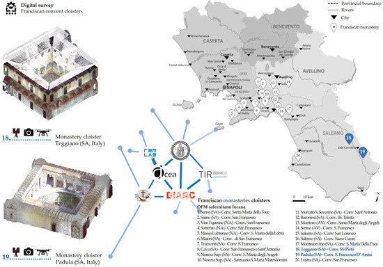 Operationally, the research started with the selection of a specific dataset for experimentation. In particular, the scientific collaboration between the Department of Civil, Construction and Environmental Engineering (DICEA), the Department of Architecture (DiARC) of the University of Naples Federico II and the Religious Provinces of the Monastic Order of St. Francis in Campania led to the construction of a dataset dedicated to the cloister typology (Figure 7). This choice represents an ideal compromise between the geometric variety typical of historical architecture and a certain degree of standardization.
