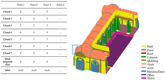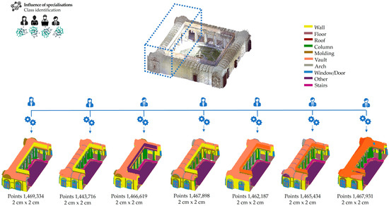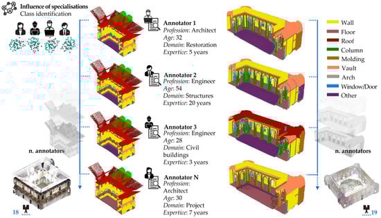 Once processed, the point clouds were subjected to a manual annotation process (Figure 8), involving the students of the II level Master’s Degree “BIM and Sustainable Integrated Design” of the University of Naples Federico II as annotators. Specifically, the sample of annotators was composed of 7 specialists in the architectural domain, differentiated by age, years of experience, and specific training. The experts involved, in fact, have a seniority that varies from 28 to 54 years, related to a professional experience accumulated in a minimum of 3 years to a maximum of 20 years. Although they are all experts in the architectural domain, the annotators attest to a training that ranges from the architectural field itself to that of civil or building engineering, which was followed by a specialization in specific aspects ranging from restoration to design and structural analysis.
