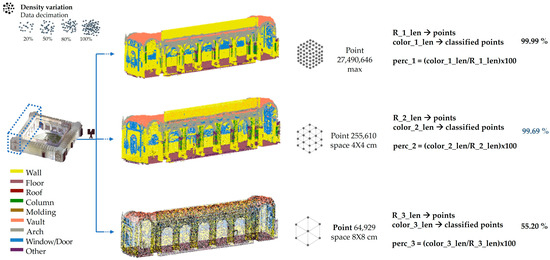 In addition, there are further operational and methodological issues that are central to the automatic classification process. Among them, the effect of spacing, i.e., the distance between points in the clouds, has a direct impact on the density of the data and, consequently, on the quality of the calculation of geometric features, affecting the possibility of correctly recognizing different architectural elements. Therefore, what is the threshold density value below which segmentation loses effectiveness is investigated in order to optimize the trade-off between model accuracy and computational complexity.