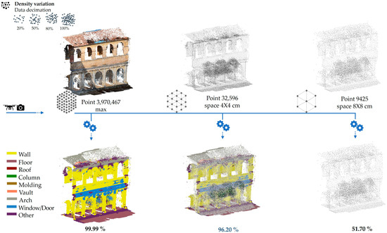 However, to date, the effects that data quality, particularly point cloud density, may have on feature class recognition, including in relation to the acquisition modes adopted, do not appear to have been thoroughly explored. This is an aspect that, in the experience of practitioners, would deserve special attention, in addition to a number of additional factors known to influence the quality and characteristics of point clouds [27,28,29].