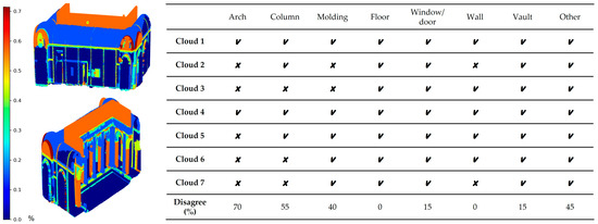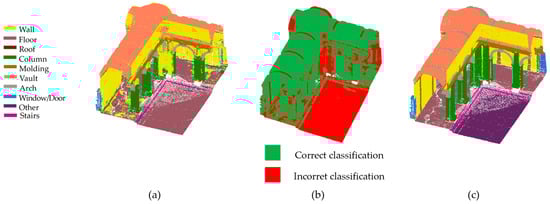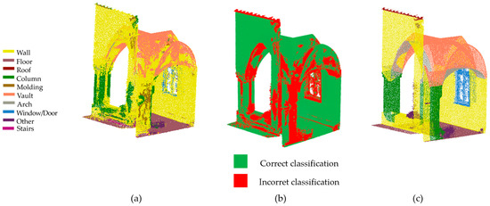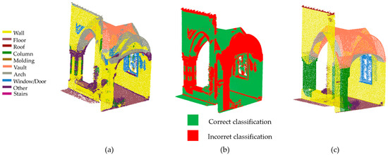 The clouds were classified using the predictive model obtained from the 3DOM unit study [24]. Subsequently, the analysis was conducted in Python, comparing the number of points correctly recognised and classified against the total number of points for each portion (Figure 9).