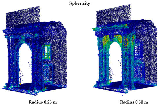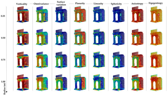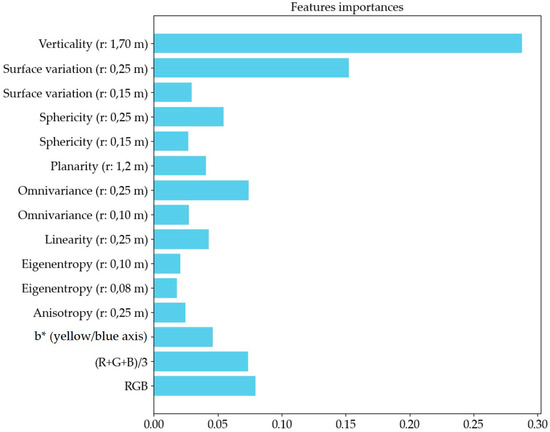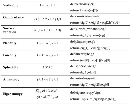 Another key aspect to consider for proper feature classification and segmentation concerns features, and particularly their selection [40]. Features provide descriptive information about the data. In the context of point clouds, these can be geometric, useful for representing the shape, arrangement, and spatial properties of objects, or radiometric, related to material characteristics, such as reflectance, which describes the light response of objects. Geometric features are derived from the computation of the three-dimensional covariance matrix based on a spherical surround of defined radius [41]. Analysis of the eigenvalues and eigenvectors associated with the matrix provides invariant information with respect to translations, rotations, and scaling [42]. Additional measurements can be derived from these eigenvalues to describe local dimensionality, such as linearity, planarity, and sphericity, which are useful for characterizing linear, planar, and volumetric structures, respectively [43,44,45].