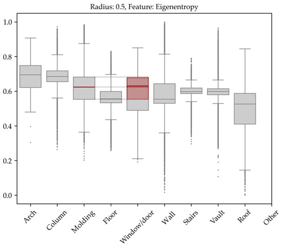 Further questions arise in the later stages of the work, particularly the appropriateness of including specific new features to improve the recognition of hard-to-distinguish features, such as arches, columns, or moldings, which are often subject to semantic overlap in the results. The impact of feature selection with respect to variation in the radius of the surround used in their calculation is also analyzed, assuming that certain radii are more effective for specific architectural classes. This leads to the development of a methodology for optimal feature and ray selection, based on statistical metrics (e.g., p-value analysis and comparative boxplots), in order to maximize separability between classes, reduce semantic ambiguity, and improve the robustness and objectivity of the predictive model.