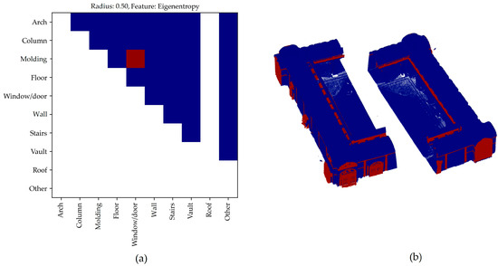 Such techniques have been widely used in several studies [24,41,51], but it should be kept in mind that wrapper-based methods provide better performance than filter-based methods, but at the same time present a significant risk of overfitting that would cause the selected subset of features not to fit in a different context. The same is true for embedded methods. In general, effective feature selection for point cloud segmentation in cultural heritage requires a balance between the representativeness of the chosen features and the ability of the model to generalize over different architectural structures, taking into account computational limitations and the availability of annotated data. For these reasons, one of the objectives of this study is to investigate a new feature selection approach so as to reduce classifier dependence and obtain good results related to the generalization of the process.