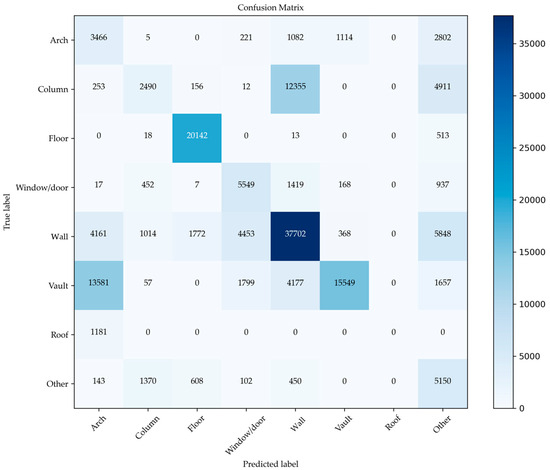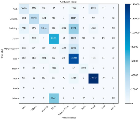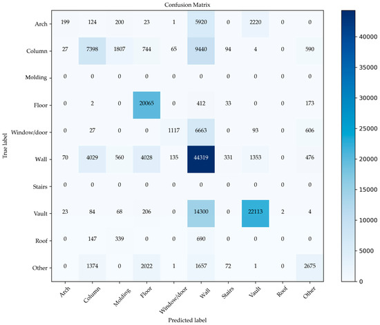 Although the results obtained are promising, this work has highlighted several open challenges. These include the difficulty in distinguishing classes with similar geometries and materials, the heterogeneity in outcomes caused by different acquisition sensors and their respective operational modes, and the influence of subjective manual annotations. Particular attention was given to the issue of the ‘Other’ class, which, functioning as a generic container, compromised the classification accuracy of specific elements such as ‘Floor’ and ‘Column’. Nonetheless, the proposed approach represents a significant step forward in the digitization and valorization of Architectural Heritage, paving the way for new interdisciplinary applications.