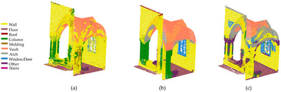 A further aspect of considerable importance, highlighted in the literature, concerns the fact that, even today, many of the methodologies applied to cultural heritage rely to a large extent on manual interventions, both for the interpretation of the objects within the point clouds and for the creation of the annotated datasets needed to train the models [30,31,32]. Although the first semi-automated annotation solutions, mainly based on semantic image segmentation with subsequent 3D back-projection, are gradually becoming popular [33,34], the phase of pre-annotation and interpretation of point clouds still remains a particularly challenging step. This is not only because of the high degree of complexity of geometries and the lack of repetitiveness of elements across architectural types, but also because of the critical delicacy of the task, which requires accurate and consistent identification of architectural components and sub-components. This process is often influenced by the cultural background, education, and experience of the annotator, factors that can generate ambiguity in the classification and association of elements to categories shared and recognized by the scientific community [35,36]. The annotators’ educational background plays a significant role in determining the quality and consistency of the annotation process. Annotators with a background in art history or architectural history tend to adopt a stylistic or typological perspective, focusing on chronological, decorative, or symbolic aspects of architectural elements. In contrast, annotators trained in Architecture or engineering—particularly in the fields of restoration or design—may apply a more structural and functional approach, classifying elements based on their construction role or their position within the spatial and distributive system [37].