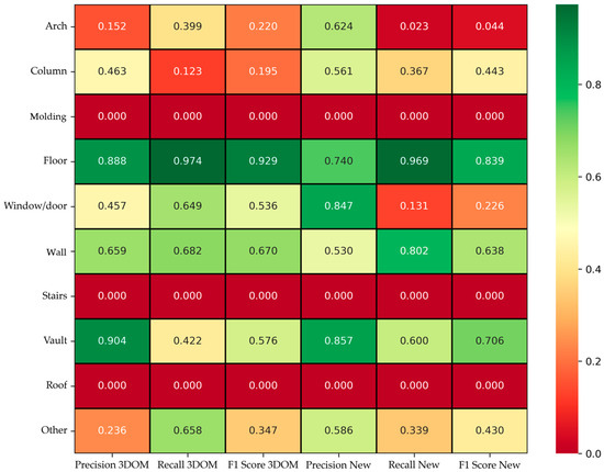 The F1-score confirms these trends, showing improvements for some classes and decreases for others. However, some categories, such as ‘Molding’, ‘Stairs’, and ‘Roof’, obtain zero values in both models, signaling difficulties in their classification. This could be due to the scarcity of data for these classes, their morphological complexity, or the intrinsic limitations of the models used.