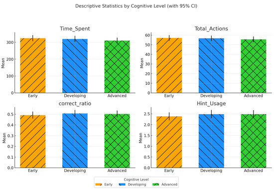 Descriptive statistics for four continuous dependent variables across cognitive levels (Early, Developing, Advanced). Each subplot displays the mean values with 95% confidence intervals for Time Spent, Total Actions, Correct Response Ratio, and Hint Usage. Distinct colors and hatch patterns are used to differentiate cognitive levels consistently across plots: orange with forward slashes (Early), blue with backslashes (Developing), and green with crosshatch (Advanced).