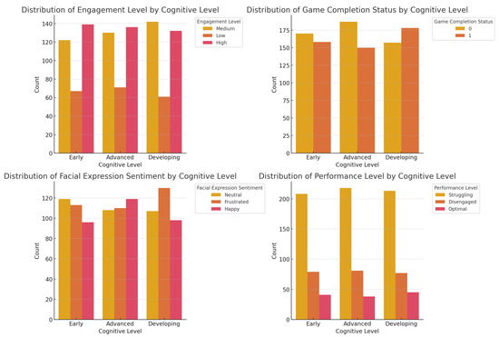 Distributions of four nominal dependent variables across cognitive levels (Early, Developing, Advanced). Each subplot displays the frequency of participants per category for Engagement Level, Game Completion Status, Facial Expression Sentiment, and Performance Level, grouped by cognitive level. Bars are color-coded by response category, providing a visual summary of categorical trends and variations in affective and performance-related states.