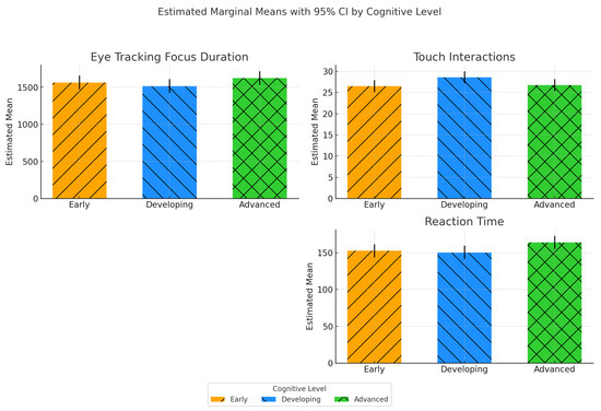 Estimated marginal means for three sensor-based interaction measures across cognitive levels (Early, Developing, Advanced). Each subplot presents the adjusted mean values with 95% confidence intervals for Eye Tracking Focus Duration, Touch Interactions, and Reaction Time. Distinct colors and hatch patterns are used consistently to represent cognitive levels: orange with forward slashes (Early), blue with backslashes (Developing), and green with crosshatch (Advanced).