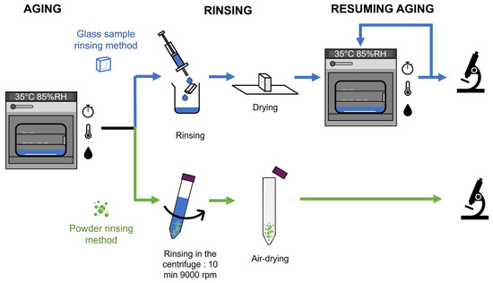 These GM-3m and GM-6m (rinsed and not rinsed) were then aged in the same atmospheric conditions at 35 °C and 85% RH (Figure 1). The corresponding results are presented below in Section 3.2.