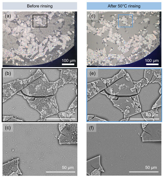 GM-6m glass surface before and after rinsing with water at 50 °C. (a,d) OM images, magnification × 500. (b,c,e,f) SEM-BSE images (Hitachi) at 15 keV. The area observed by SEM-BSE (b,e) is indicated with a black and blue rectangle on the optical images (a,b). (c,f) presents the surface state of the glass beneath the flakes.