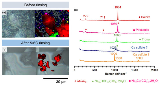Before rinsing (Figure 3a), different types of salts could be identified. Calcite (red color, with major peaks at 1084 cm−1, 711 cm−1, and 279 cm−1 [29]) is preponderant on the surface. The intense peaks at 1060 cm−1 and 1069 cm−1 were assigned to the symmetric stretching of the carbonate group in trona (Na3(HCO3)(CO3)2·2H2O) (green) and pirssonite (Na2Ca(CO3)2·2H2O) (pink), respectively, based on the RRUFF database (R050228 for trona and R070192 for pirssonite) [30,31] and on their detection in the XRD diagrams of the altered powder (Figure 4 and Figure 5). Calcium sulfates were also found (1025 cm−1, assigned to CaSO4 anhydrous III [32]) with their band always linked with trona bands. Another minor species with its main peak at 1000 cm−1 suggests another sulfate (yellow). Because the Raman analysis was carried out 12 months after the end of the aging, sulfate compounds had time to form through dissolution of atmospheric SO2 in the water film adsorbed on the altered glass surface and through reaction with the basic species (Na+, Ca2+, and OH−) in equilibrium with the basic carbonates like pirssonite. These sulfate compounds could accumulate over time at the expense of the carbonates because they are more insoluble than the carbonates. This is observed in the “dry” weathering of stained glass [33]. The association of sulfates with trona is attributed to the more acid character of the sulfate surrounding region (sulfate and trona are more acidic salts than thermonatrite Na2CO3·H2O, or pirssonite). After 50 °C water rinsing, only calcite remained on the surface.