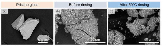 Effect of rinsing on altered powders (SEM-BSE images): (a) pristine glass and (b) GP-15m and (c) GP-15m after 50 °C water rinsing.