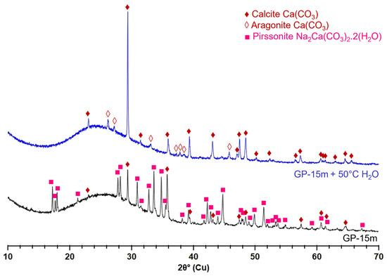 XRD diagrams (Cu Kα radiation) of the GP-15m powder not rinsed or rinsed with water at 50 °C and centrifugated. The JCPDS reference numbers are 01-083-3289 for calcite, 01-075-9986 for aragonite, and 04-025-3514 for pirssonite.