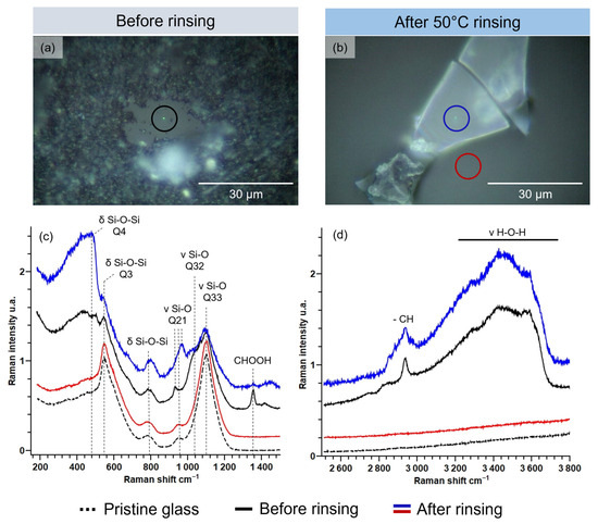 The impact of water cleaning on the silicate network structure of the hydrated layer is studied by Raman spectroscopy in Figure 7. Figure 7c shows the 150–1500 cm−1 region, and Figure 7d shows the 2500–3800 cm−1 region. The optical microscopy image in Figure 7a shows a lot of salts on the altered glass surface, mainly calcite, as previously determined (Figure 2). Moreover, this glass monolith also presents some detached and removed flakes, showing the glass below, but these are not visible on the optical microscopy in Figure 7a. The presented point analysis was carried out on areas with no salts and where the altered glass surface was visible, as in the black-circled area in Figure 7a. The analysis was also performed on the glass below the flake, and the spectrum (not shown) was identical to the Raman spectrum of the pristine glass (black dotted line). After the rinsing step, Raman analysis was carried out on the top of one flake (blue circle) and on the glass below (red circle). The Raman spectrum of the glass below the flakes (red line) was also identical to the Raman spectrum of the pristine glass, which tells us that the flakes, both before and after the rinsing step, represent all the hydrated layer and cover the pristine glass.