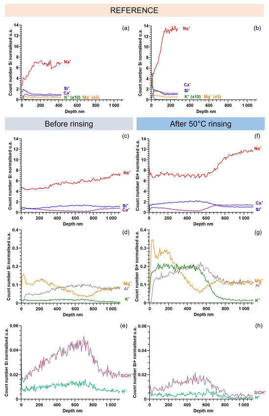 Finally, SiOH+ and H+ ions depth profiles are plotted in Figure 8e,h. Their absolute intensity cannot be compared because both measurements were performed at different moments, with different levels of residual hydrated species in the ToF-SIMS chamber. Their profile did not change much before and after rinsing.