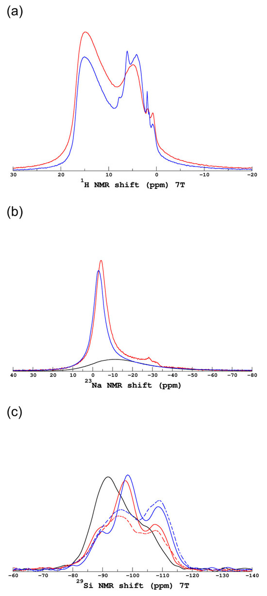 (a) 1H, (b) 23Na, and (c) 29Si MAS NMR spectra of the GP-15m powder before (red line) and after (blue line) rinsing at 20 °C. All samples were heat-treated at 150 °C before the NMR measurements. For 29Si NMR spectra, the GP-15m powders were measured before (continuous line) and after (dotted line) the heat treatment at 150 °C. The solid black lines depict the spectra of the pristine glass.