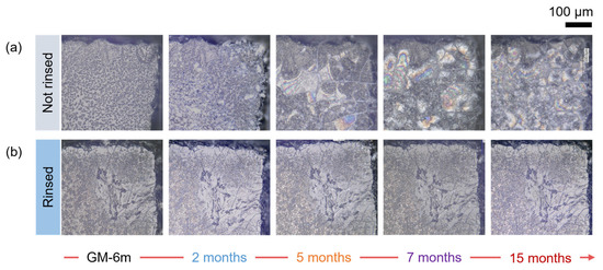 Two samples altered for 3 months (GM-3m) or 6 months (GM-6m) were engaged in the experimental study of the effects of water cleaning on the pursuit of the alteration. One sample was cleaned with water, and the other was the control sample. For these four samples, aging was resumed for 2, 5, 7, and 15 months in the same aging conditions (35 °C and 85 RH%). After every duration, the samples were taken out of the airtight box, characterized, and placed back in the box.