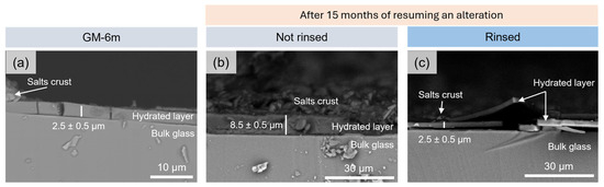 The effects of rinsing the altered powder GP-15m were evaluated by SEM-BSE (Figure 4). After 15 months of aging, cracks and salts appeared on the particles’ surface. The impact of the rinsing with 50 °C water is barely visible in these images. As already seen with the glass monoliths, only the tiny salts were removed from the surface. Note that the GP-15m powder was stored only for one month between the end of the aging and the SEM and XRD study of the water cleaning.