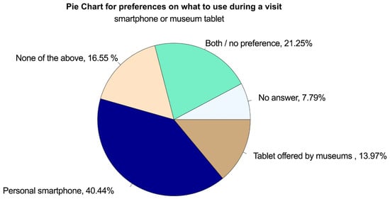 Digital tools for improving the visitor experience: No single digital tool was considered to be the most or least useful; preferences varied by age group. Younger and middle-aged visitors preferred interactive technologies such as multi-touch tables and immersive environments, while older visitors (65+) preferred classic audio guides. This reflects the tendency of older users to find advanced technologies more difficult to navigate (Figure 3). In general, all visitors preferred to use their smartphones or personal devices (Figure 4).
