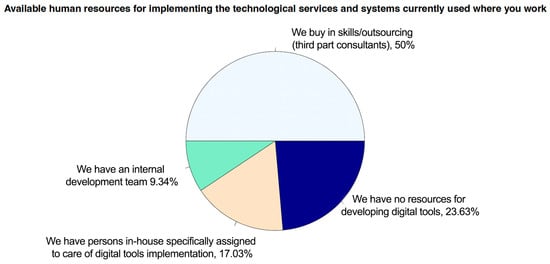 - Human resources: Most organizations do not employ dedicated professionals for technological implementation. Instead, they rely on third-party consultants or lack the resources to develop digital tools internally. This indicates a need for training and upskilling heritage professionals to become active agents in the digital transformation of cultural heritage institutions (Figure 9).