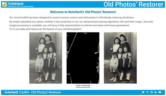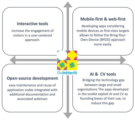 This section explores the integration of AI and CV in enhancing visitor engagement in museums, highlighting the key insights from recent research and the development of the ReInHerit strategy6. In particular, we examine how AI technologies are revolutionizing museum operations and visitor experiences, including opportunities for personalization and interactive engagement. In recent years, the concept of the ‘smart museum’ has emerged as an innovative model, where AI-based technologies—from facial recognition to real-time translation—animate otherwise static collections, creating an experience that connects people, education, culture, and art []. Recent studies on Human–Computer Interaction (HCI) and museum studies have further emphasized the importance of emotional interaction [] and embodied engagement [] in digital cultural heritage experiences [,]. Researchers argue that digital systems should be designed not only for usability but also to support affective interaction and participatory meaning-making, aligning with the growing discourse on “affective heritage” and experience-centered design []. In parallel, the increasing use of AI in the cultural heritage sector has raised a number of critical concerns, particularly regarding transparency, algorithm bias, privacy and data ownership. The current debate emphasizes the importance of incorporating ethical frameworks from the earliest stages of technology design. These theoretical and ethical perspectives formed the conceptual basis of the ReInHerit strategy, which translates them into practice through user-centered, playful and emotionally engaging digital tools. The ReInHerit Toolkit was developed through a co-creative and interdisciplinary methodology involving heritage professionals, ICT experts, and end users. This approach ensured that the tools are adaptable to diverse institutional contexts and aligned with the principles of sustainable innovation.