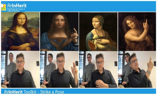 These two computer vision applications aim to engage visitors with artworks by detecting and interpreting body movements and facial expressions. Both are based on a “play and engage” approach that encourages active visitor engagement with cultural content, moving beyond passive observation. This model is also inspired by the neurological concept of mirror neurons, which are associated with understanding others’ actions and emotions through internal simulation. By inviting users to replicate poses and expressions found in art, the applications foster an empathic and embodied interaction with cultural heritage []. Gamification, understood as the application of game-like dynamics in non-game contexts, has proven effective in enhancing museum sustainability and visitor engagement []. Within this framework, Strike-a-Pose and Face-Fit demonstrate how gamified digital tools can transform heritage experiences into more playful, social, and personalized journeys of discovery—fully embracing the “I play, I learn” principle []. They support a transition from the traditional “look but don’t touch” museum experience to one that invites visitors to “play and engage”, making cultural learning both memorable and meaningful. Accordingly, the objectives of these two applications are as follows: