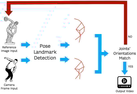 Processing flow for pose detection and matching. The reference image and the camera frame input undergo pose landmark detection. If the joints’ orientations match, an output video is generated; otherwise, the flow loops back for further comparison.