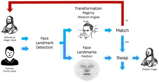 Processing flow for facial landmark matching and face swapping. The reference image and the camera frame input undergo facial landmark detection. If the landmarks and orientations match, a face swap is performed to generate the output image.