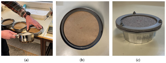 The test samples were tested using the cup method described in NS-EN ISO 12572:2016 [48]. The test cups were filled with a salt solution, with an air gap of 15 mm above the solution. The salt solution used for the test specimens was KNO3(VWR Chemicals, Chile), which provided a constant relative humidity (RH) of 94% [48]. The test samples with diameters of 0.174 m were then attached to the cups using a sealing compound, with the specimen test area diameter set to 0.164 m. The test samples with diameters of 0.090 m were attached to the cups using a gasket and a screwed-on metal ring, making the diameter of the specimen test area 0.075 m. Figure 2 shows the sealing compound on the test specimens.