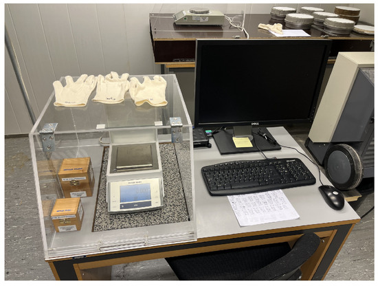 The weighing of the test specimens was conducted inside the test chambers to ensure that the samples were exposed to constant relative humidity and temperature throughout the test period. For the Gintronic GraviTest, the machine placed the test cups on an internal scale and then lifted them back into position. During weighing, the positions of the test objects were rotated. For manual weighing, a scale located inside the test room was used, specifically METTLER TOLEDO, with an accuracy of 0.001 g. The weight was connected to a computer, allowing the measured weight to be transferred directly into an Excel spreadsheet. A calibration weight was measured before and after each test set to correct the scale’s readings. Figure 5 illustrates the setup for manually weighing the test specimens. The scale was placed inside plastic housing to protect the measurements from disturbances.
