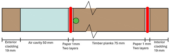 The simulations were based on a standard timber plank frame wall, as shown in Figure 1. The thickness of the timber planks was set to 75 mm, which is roughly equivalent to 3 inches. A thickness of 2.5 inches to 3 inches is normally used for timber planks, with 3 inches being the most common thickness [12,14,15]. The thickness of the cavity was set to 50 mm. Cavities can vary from 35 to 70 mm large, with 50 mm being the most common size, roughly corresponding to 2 inches [13,14,16]. The internal and external timber cladding layer thicknesses were set to 19 mm. The building paper was modelled as a layered material by utilising the liquid transport properties of craft paper listed in the built-in WUFI® Pro material database [49]. The building paper’s thickness was set to 1 mm in WUFI® Pro due to numerical convergence reasons. The resistance factor was adjusted to match the values of the tested building paper. The monitor’s location was placed at the most vulnerable position on the wall, as marked with a green dot in Figure 6.