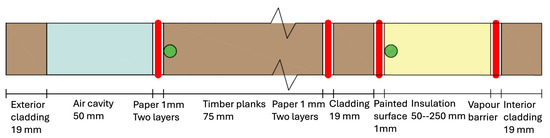 The wall configuration of the internally retrofitted timber plank frame wall is shown in Figure 7. The monitors were placed at the most vulnerable positions on the wall, the positions of which are marked with green dots. The original configuration was maintained, and the insulation was installed inside the original interior cladding. The construction was simulated with different insulation thicknesses and materials to evaluate their impact as the building became more energy efficient. The effects of 50 mm and 100 mm internal insulation thicknesses were controlled because these thicknesses are commonly used for retrofitting such walls (see Figure 1). In addition, a more extreme variant of 250 mm, fulfilling the U-value requirements of the Norwegian building code for new buildings [4], was controlled. The selected insulation products comprised mineral wool with modified thermal conductivity, from the Fraunhofer-IBP database, and wood fibre insulation from Pavaflex—with modifications made to align it with Hunton Nativo—from the Fraunhofer-IBP database [56,57]. Mineral wool was controlled due to the dominant share of the retrofitting insulation market for timber houses in Norway. The wood fibre insulation was also controlled, because it is supposed to be more vulnerable to moisture.
