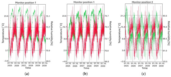 Data on air exchange in slightly ventilated cavities behind old timber cladding are limited. The air exchange rate used in this study was based on a single short-term test with new cladding, which may not represent older assemblies and introduces uncertainties. However, the value is supported by measurements, offering a more reliable basis than a rough estimate. We assumed that an exchange rate of 0 h−1 is highly conservative, as it implies no moisture removal via airflow. For more details, see the Data Availability Statement.