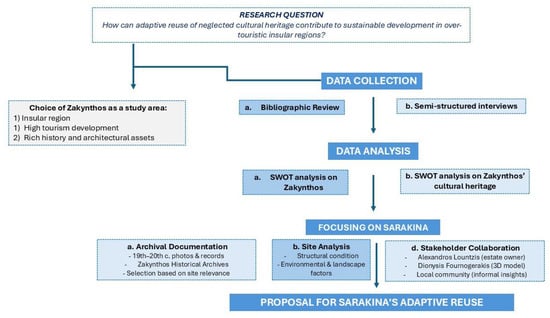 This study adopts a qualitative case study methodology to investigate how the adaptive reuse of neglected cultural heritage can foster sustainable development in overtouristic island settings (Figure 1). Using the Sarakina Mansion on Zakynthos as the central case, the research is guided by the following question: How can the adaptive reuse of neglected cultural heritage contribute to sustainable development in overtouristic insular regions?