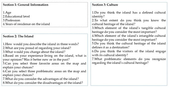 To understand Zakynthos from the residents’ point of view, thirty semi-structured interviews across groups, professions, and regions of the island were conducted. The interviews were structured in three sections as follows: the first section had to do with general information, the second with the opinions of the residents about the island, and the third section was focused on Zakynthos’ residents’ opinions about the island’s cultural heritage (Figure 5).