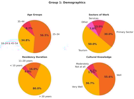 Five participants belonged in the age group 18–24 and 45–54 (16%), eight in the age group 25–34 (26%), and four in the age group 35–44 (4%). Half of them work in tourism (50%), nine in the primary sector (30%), four of them in services (13%), and one in other sectors of the economy (7%). Most of them have stayed on the island for more than twenty years (80%), five participants from eleven to twenty years (16%), and one participant for less than ten years (4%), (Figure 6).