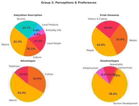 Following the questions about the island, 30% of the answers about the description of Zakynthos had to do with nature, 15% of them had to do with culture, 16% of them had to do with local people, 4,5% of them had to do with everyday life, 5,5% had to do with local products and 22% of them had to do with tourism. The elements of Zakynthos that make its residents proud of the island are its people (43%), its nature (33%), and its history and culture (24%), and the majority of them feel that life on the island was better in the past (62%). The majority of them prefer locations in the northern part of the island, mostly because of the natural beauty and architectural assets (75%), whereas 80% of the residents feel that the worse area of the island is Laganas, mostly due to uncontrolled tourism development. For the residents, the main advantages of the island are its nature (53%), its culture (33%), and its traditions (14%). The main disadvantages are tourism development (78%) and the difficulties in connectivity (2%), seasonality (12%), and infrastructure (8%), (Figure 7).