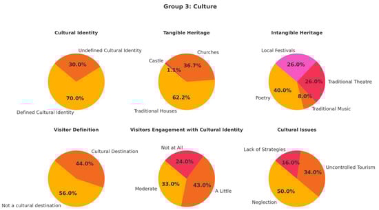 Focusing on questions related to culture, 70% of the residents feel that the island has a defined cultural identity. Ten of the participants feel that they know the island’s cultural heritage very well (33%), half of them well (50%), three of them moderately (6%), and only one of them not at all (1%). Seventeen of the participants feel that the traditional houses/architecture (56%) are the most important elements of the tangible cultural heritage of the island, twelve of them pointed out the churches (33%), and one of them the island’s castle (1%). The intangible elements of Zakynthos’ cultural heritage referenced were poetry (40%), traditional music (8%), traditional theater (26%), and local festivals (26%). More than half of the participants feel that the visitors of the island do not define it as a destination (56%), and ten of them feel that visitors engage with the island’s cultural heritage from moderately (33%) to little (43%). Finally, the major issues they pointed out about the island’s cultural heritage are neglect (50%), uncontrolled tourism (34%), and the lack of proper preservation strategies (16%), (Figure 8).