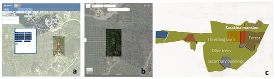 Sarakina’s aerial depictions from: (a) the national cadaster, (b) forest maps, and (c) a diagram of Sarakina’s land uses.