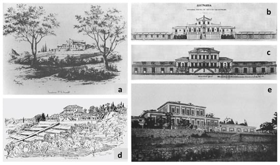 According to bibliographic research, primarily based on the published work of Dionysis Zivas [], the first recorded depiction of Sarakina is a sketch by Anastasios Sartzint (Figure 10a), dated between 1855 and 1857. This suggests that the building was constructed some years earlier. As Zivas also notes, a major reconstruction of the building was decided in the late 19th century, giving it more imposing characteristics (Figure 10b,c), as depicted in a sketch by Archduke Salvator, who visited Sarakina in 1900 (Figure 10d). The building’s form largely remained the same until the 1953 earthquake, as seen in a 1928 photograph (Figure 10e). However, it is worth mentioning that the historical documentation and precise recording of the building’s construction phases remain an independent and unexplored subject, and there is no exact depiction of Sarakina before 1953.