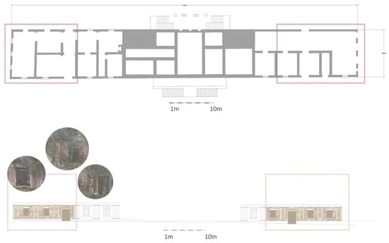 A major issue limiting both the documentation process and the development of a comprehensive restoration plan is accessibility. Even preliminary measurements could only be conducted on the ground-level sections of the southern façade, which are in a relatively better condition, and only partially on the eastern and western façades (Figure 11 and Figure 12). Beyond the building, the woodland on the eastern side forms an impressive yet wild natural landscape. The pathways that, according to the owners, once existed can now only be identified in certain areas as faint traces.