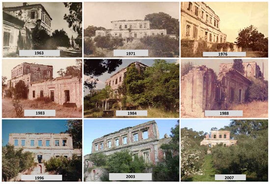 The Sarakina Mansion ceased to be inhabited after the 1953 earthquake, which caused severe damage but did not destroy it. However, due to the lack of immediate restoration efforts, subsequent earthquakes and weather conditions led to its current ruined state (Figure 11). From the last indicative site survey conducted by D. and A. Vlachopoulos, K. Zampas, and Ch. Papakonstantinou in March 2006 to the most recent visit in April 2023 [], it was observed that the building’s already significant deterioration has worsened.